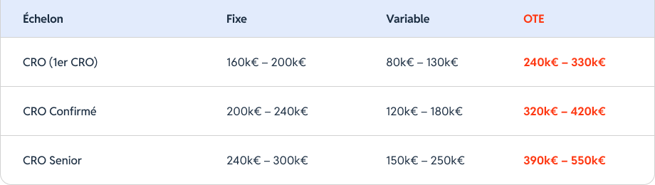 Les repères ci-dessous reflètent des pratiques courantes en Software/SaaS et Services Tech. Les packages varient fortement selon l’ARR, la maturité (Série A/B/C), l’international, et l’ampleur du scope (Sales seul vs Revenue complet).