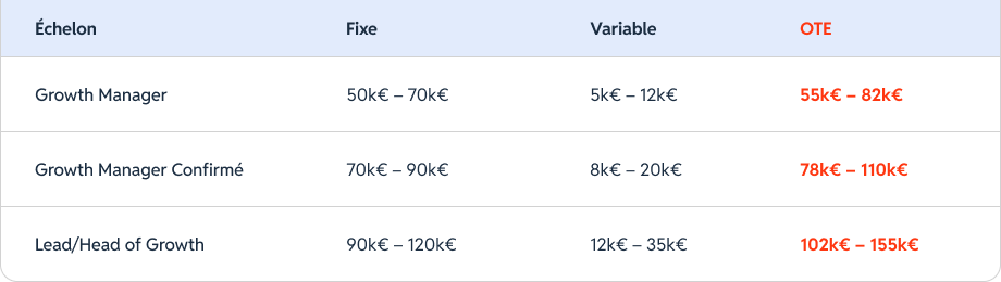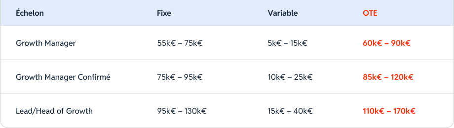 Les repères ci-dessous reflètent des pratiques courantes en Software/SaaS et Services Tech, avec des packages très dépendants du scope (growth marketing vs product growth), de l’autonomie, et du niveau de séniorité (IC vs management).