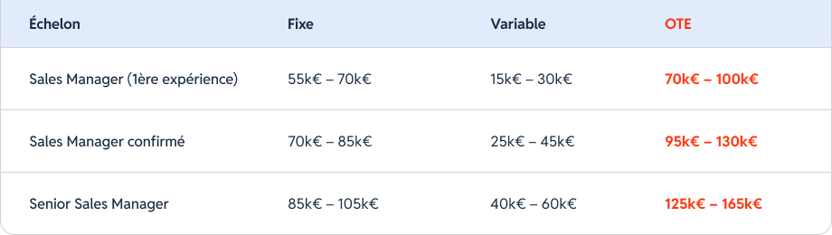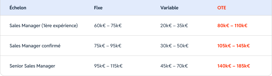 Les repères ci-dessous reflètent des pratiques courantes en Software/SaaS et Services Tech, avec un package très dépendant du périmètre (nombre de reps, segment SMB/Mid/Ent, responsabilité new biz vs expansion).